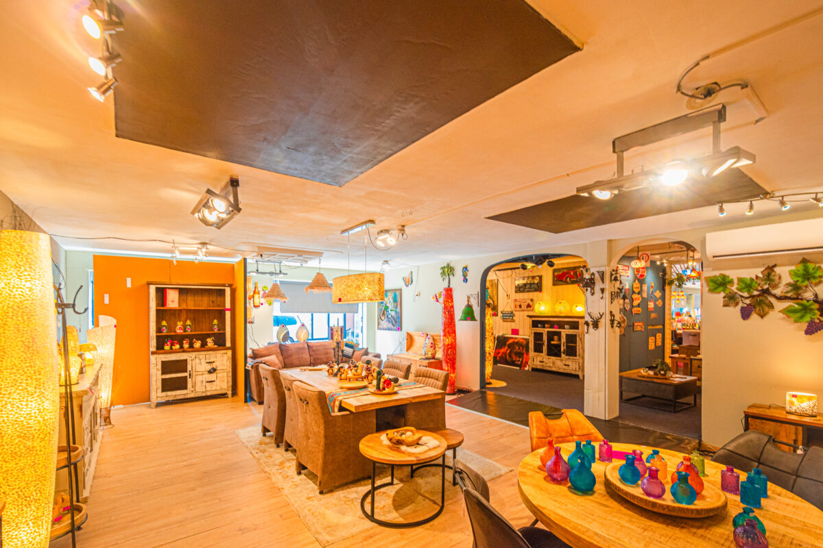 Via de Molenstraat betreedt u de toonzaal langs de dubbele glazen deuren. De toonzaal heeft langs volledig straatzijde ramen als etalage en is voorzien van de nodige aankleding (tapijt en ophangsystemen), convertorputten en 3 binnen units van de airco.